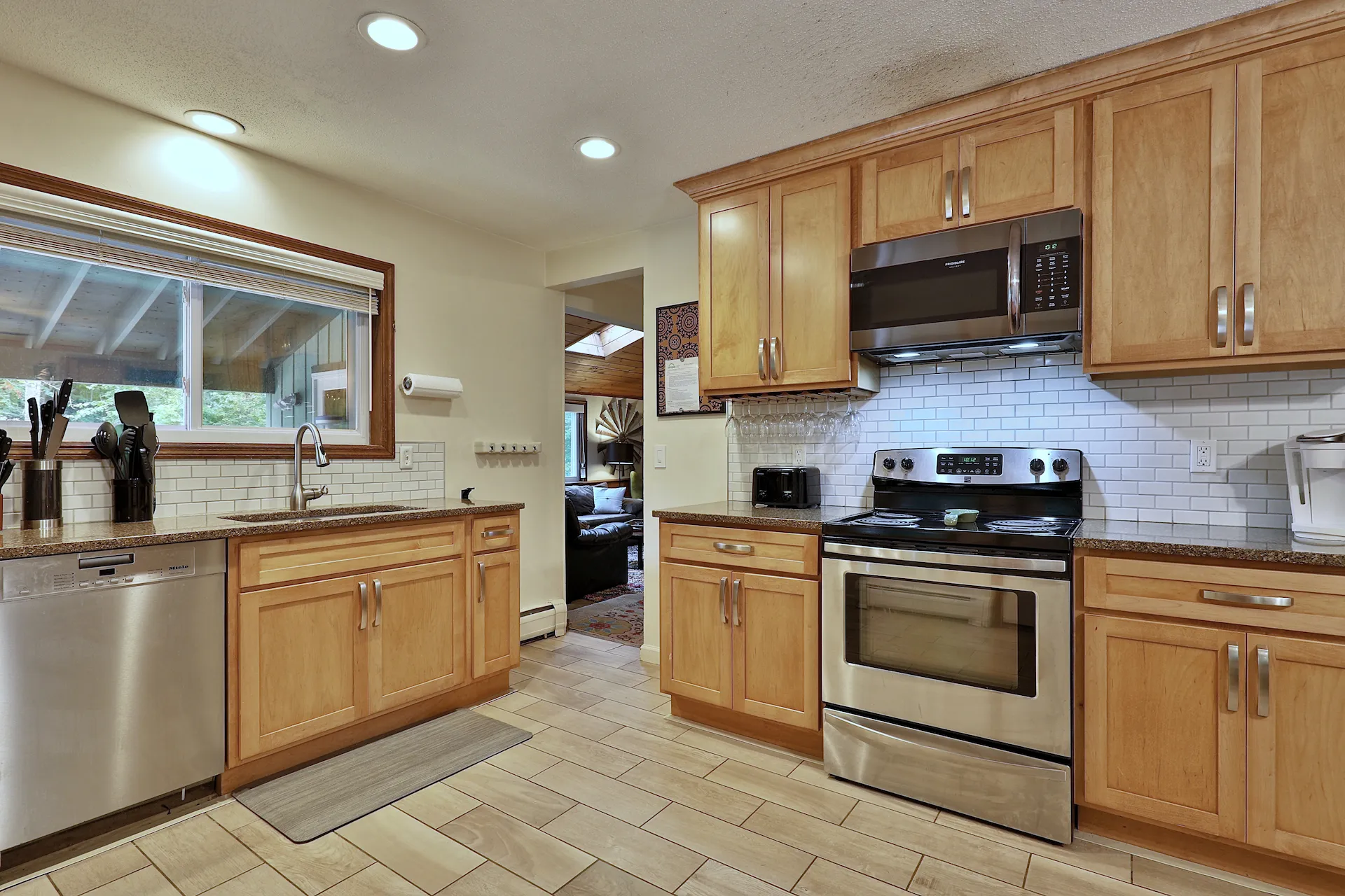 The Snowdaze kitchen is fully equipped for large groups, featuring two refrigerators and all necessary cookware.